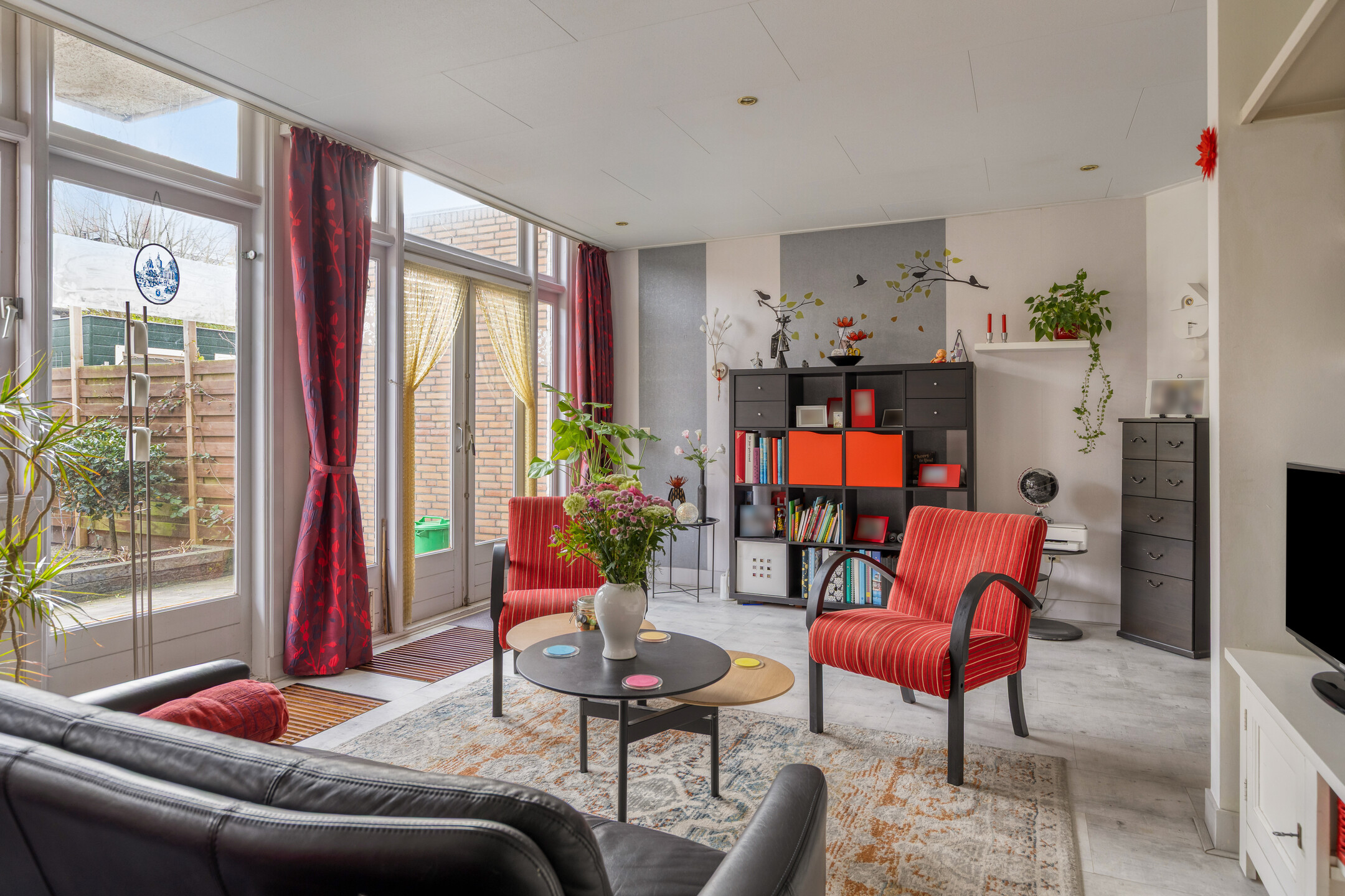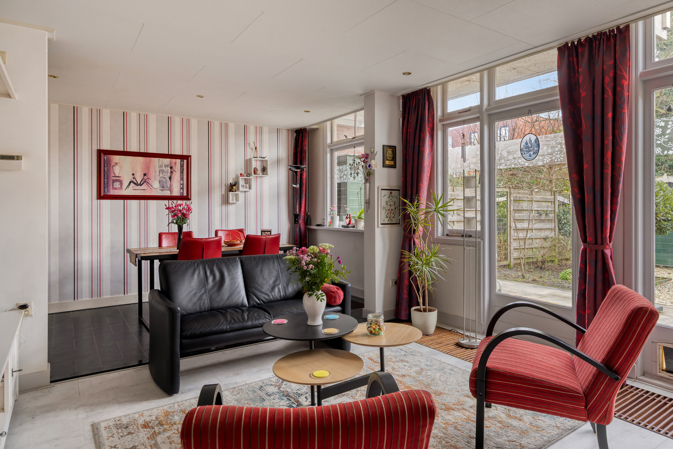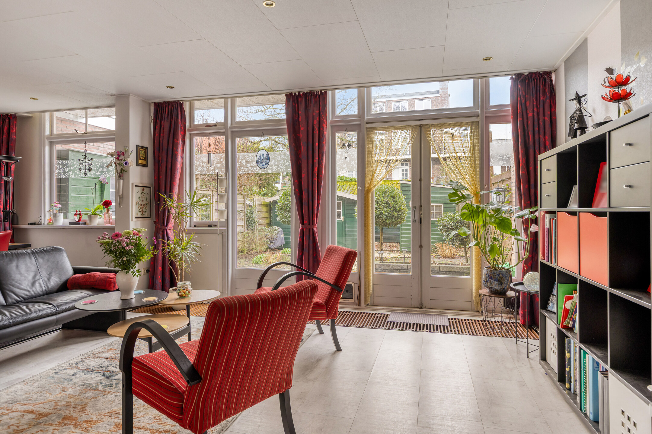 De lichte en sfeervolle woonkamer is gelegen aan de achterzijde van de woning en beschikt over openslaande deuren naar de zonnige achtertuin. Hierdoor ontstaat een prettige verbinding tussen binnen en buiten.