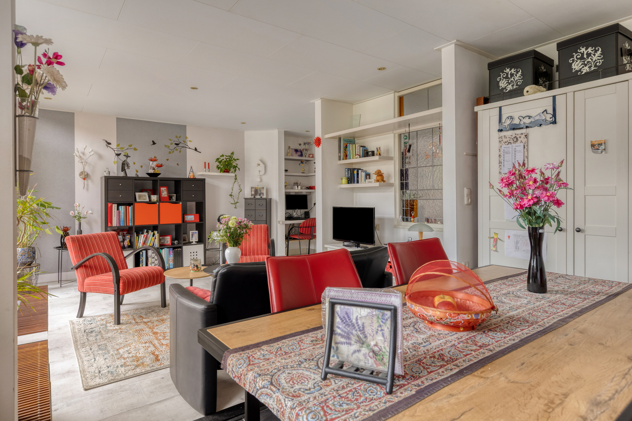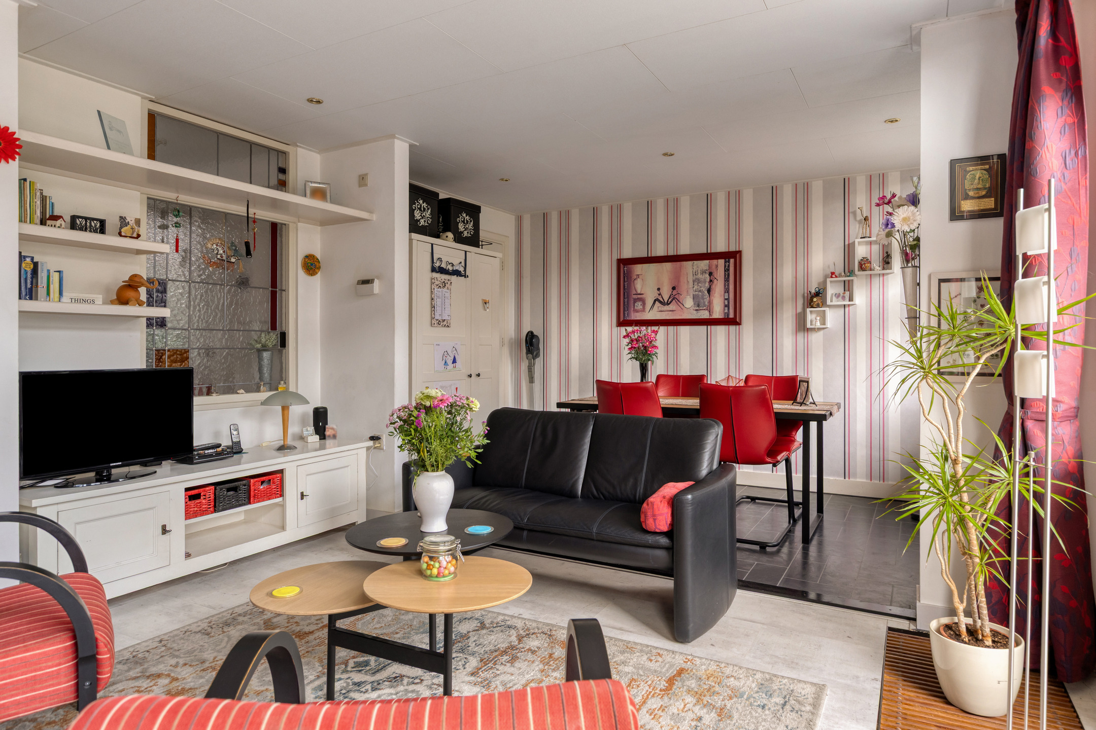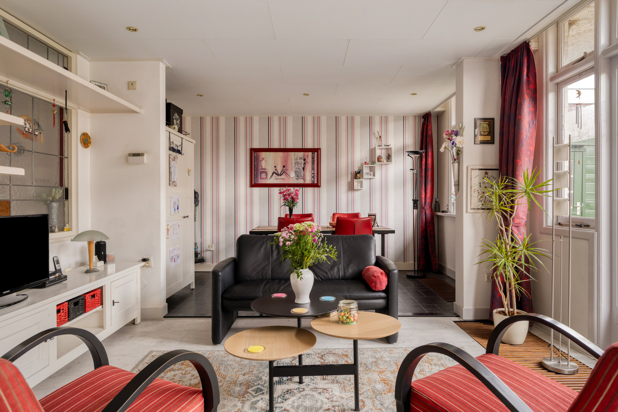 De lichte en sfeervolle woonkamer is gelegen aan de achterzijde van de woning en beschikt over openslaande deuren naar de zonnige achtertuin. Hierdoor ontstaat een prettige verbinding tussen binnen en buiten.