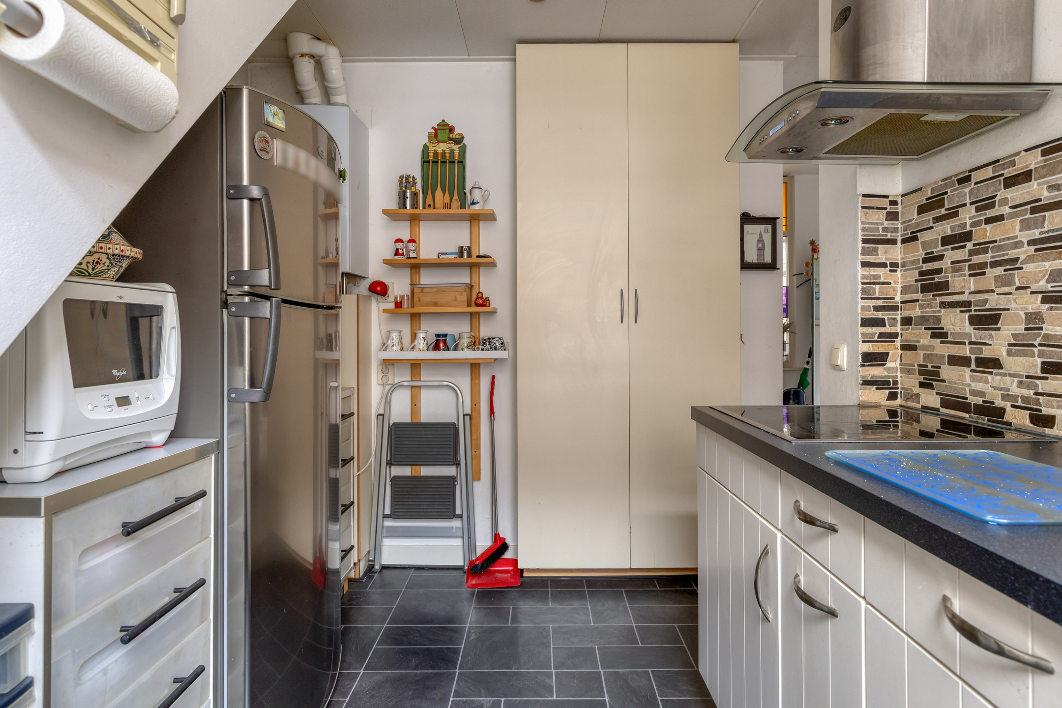 Ook de gesloten keuken is aan de voorzijde gesitueerd en is ingericht met een landelijk keukenblok. Tevens bevindt zich hier de opstelling van de cv-ketel.
