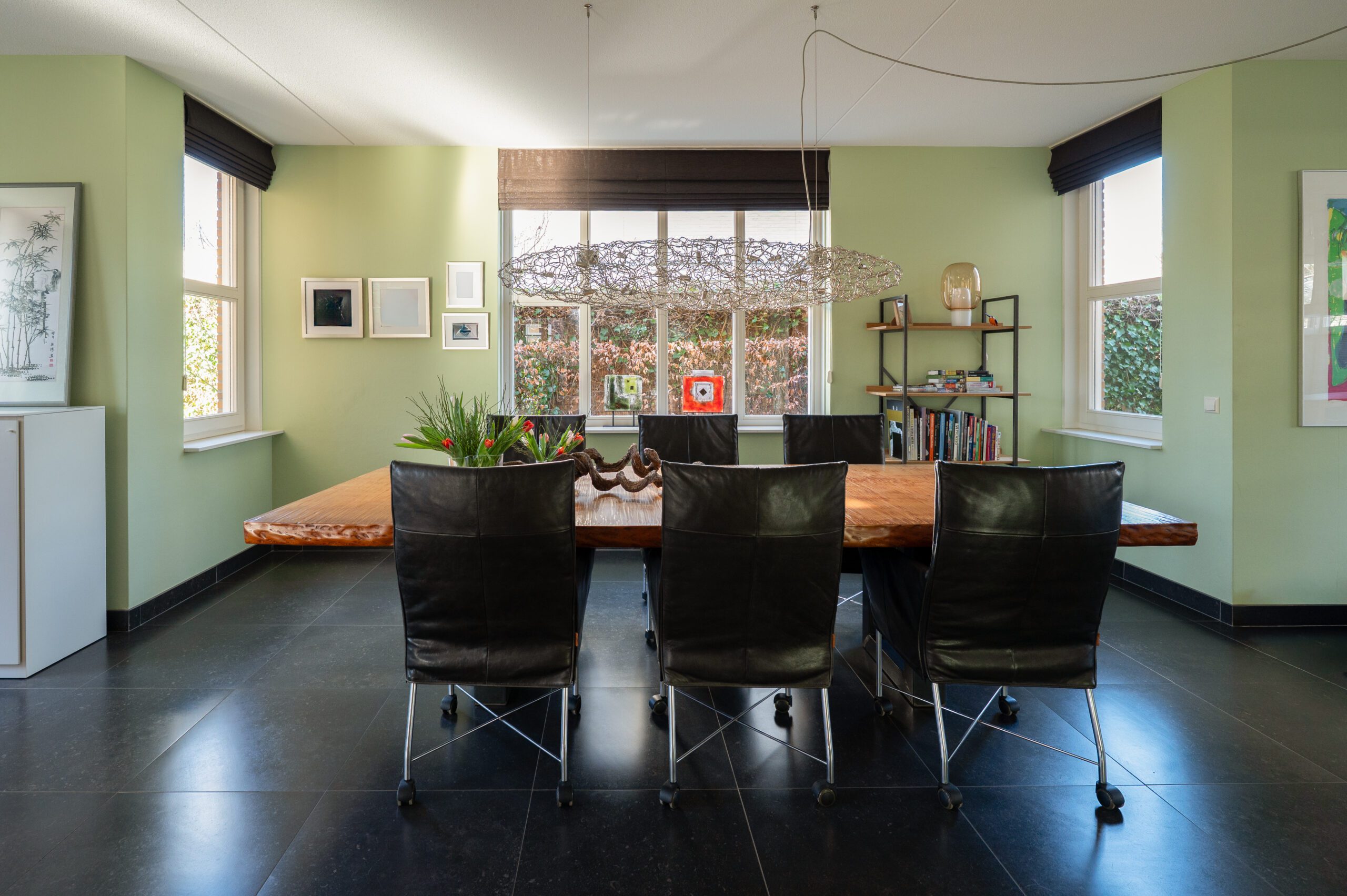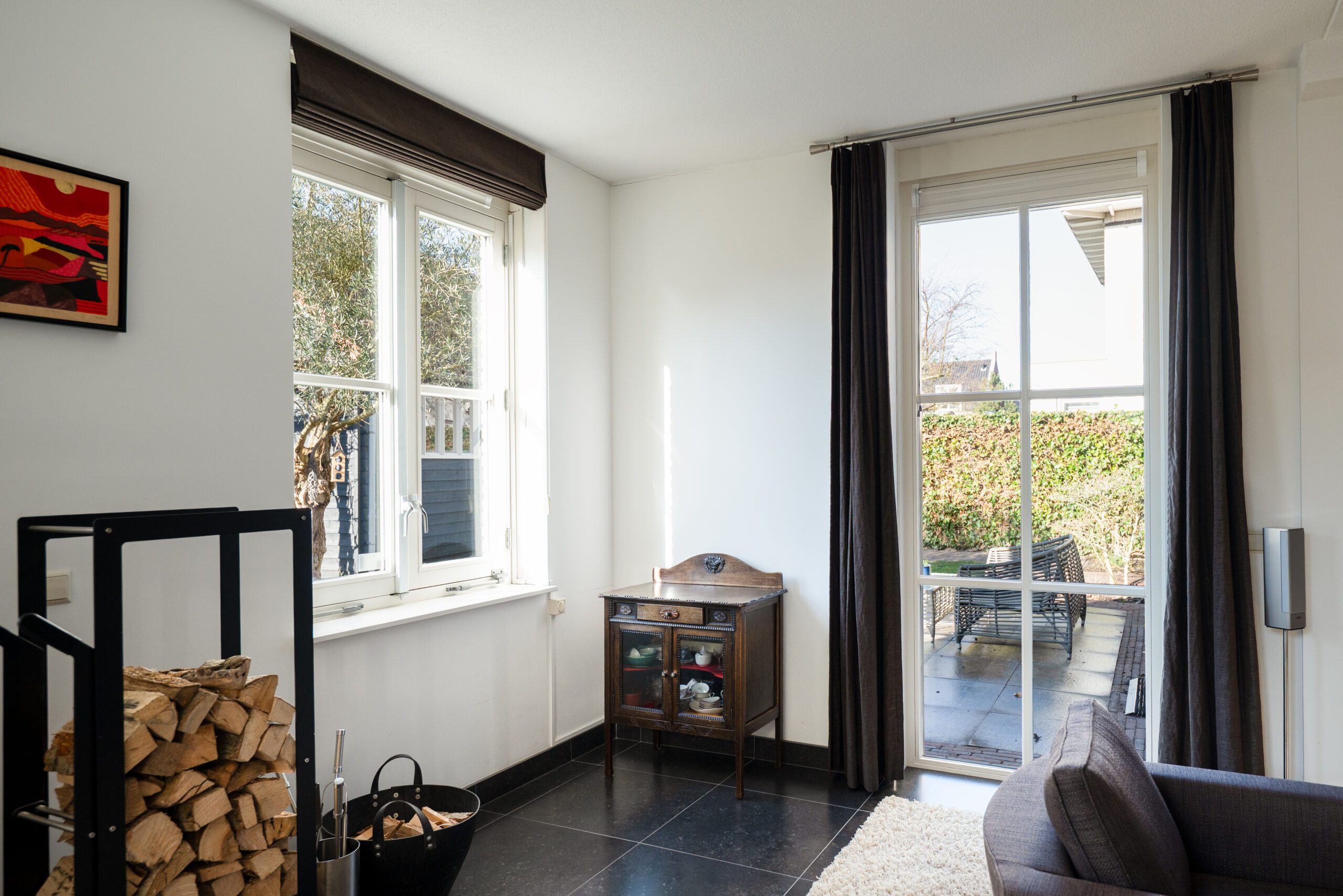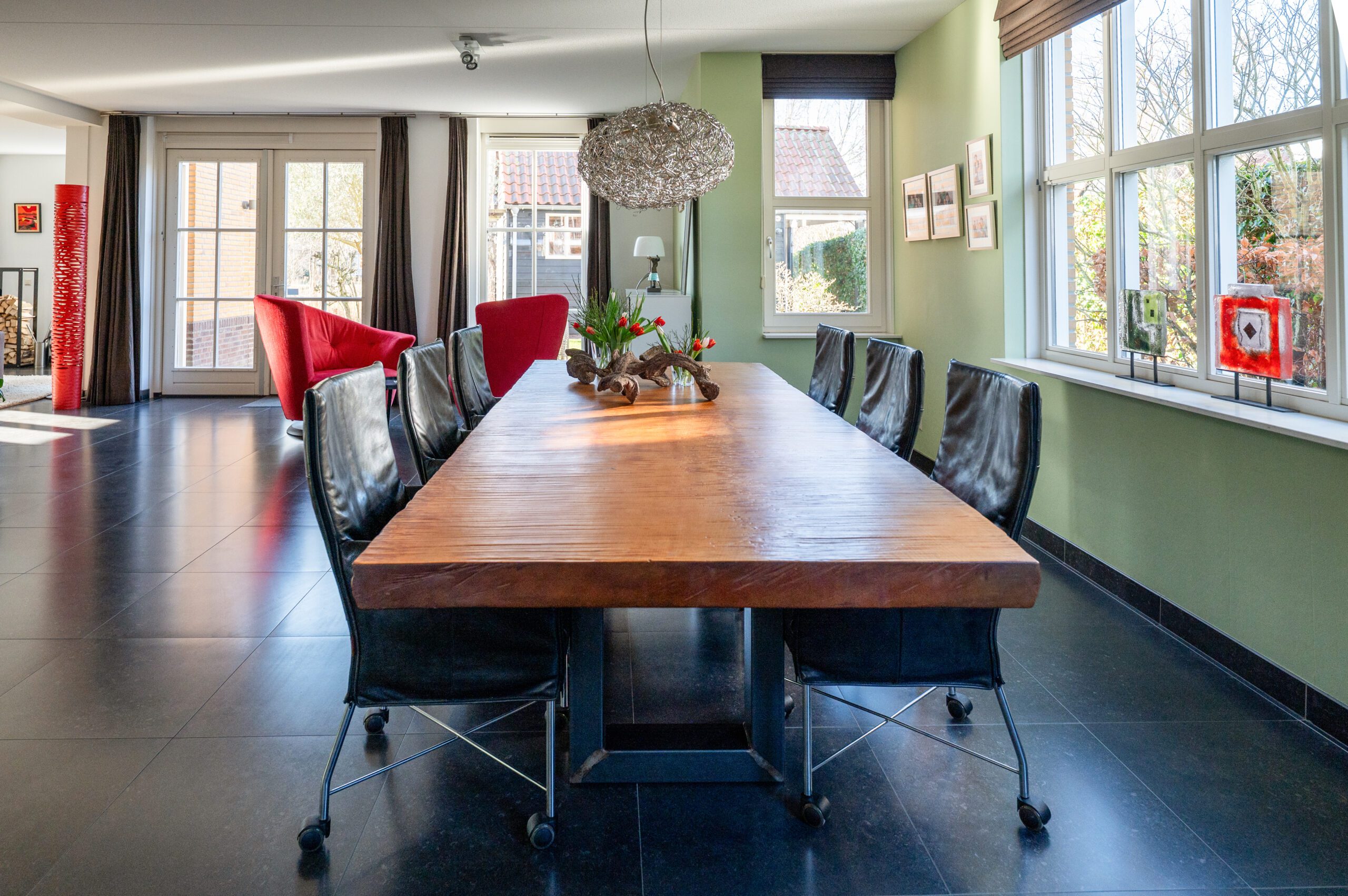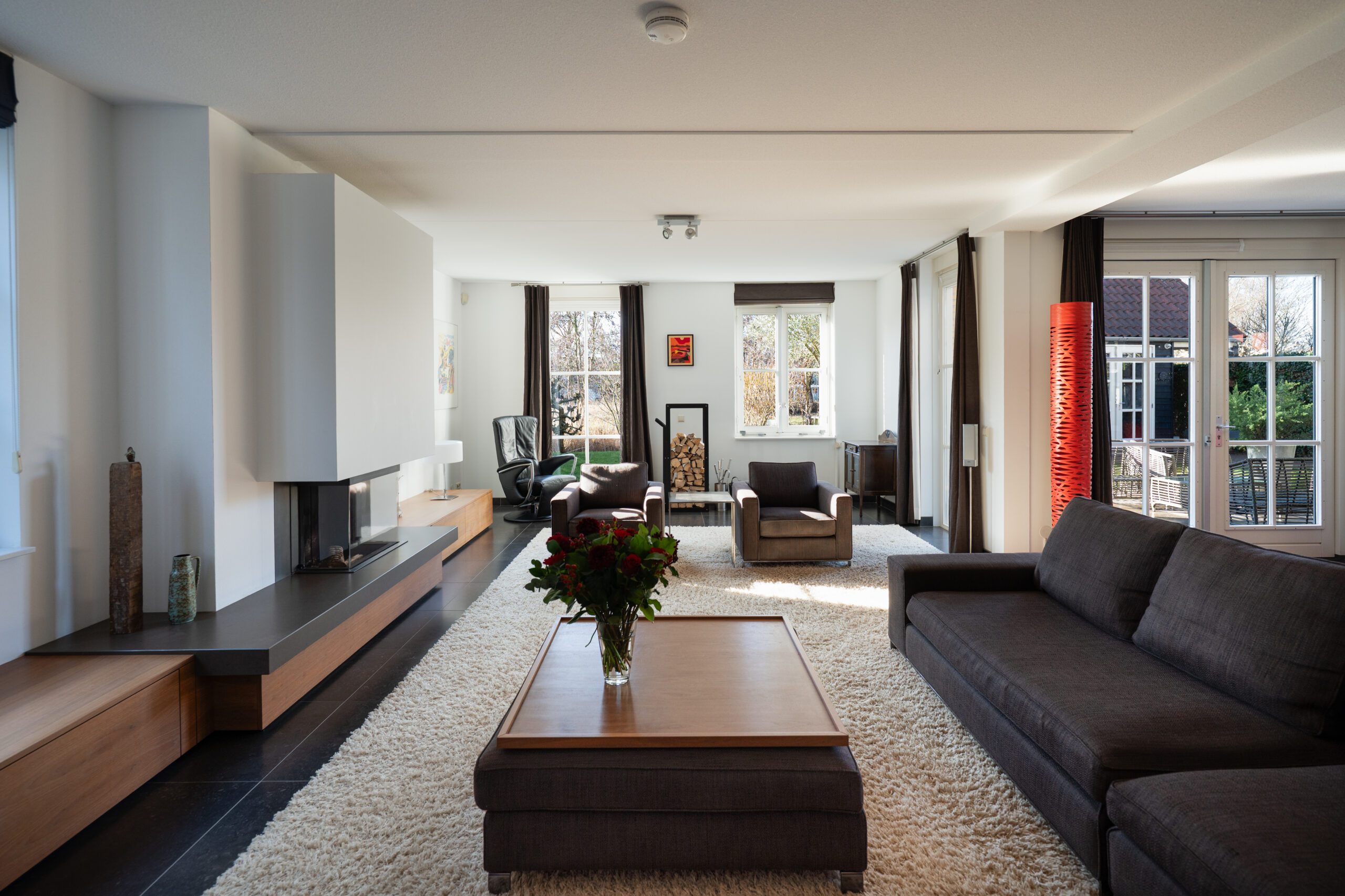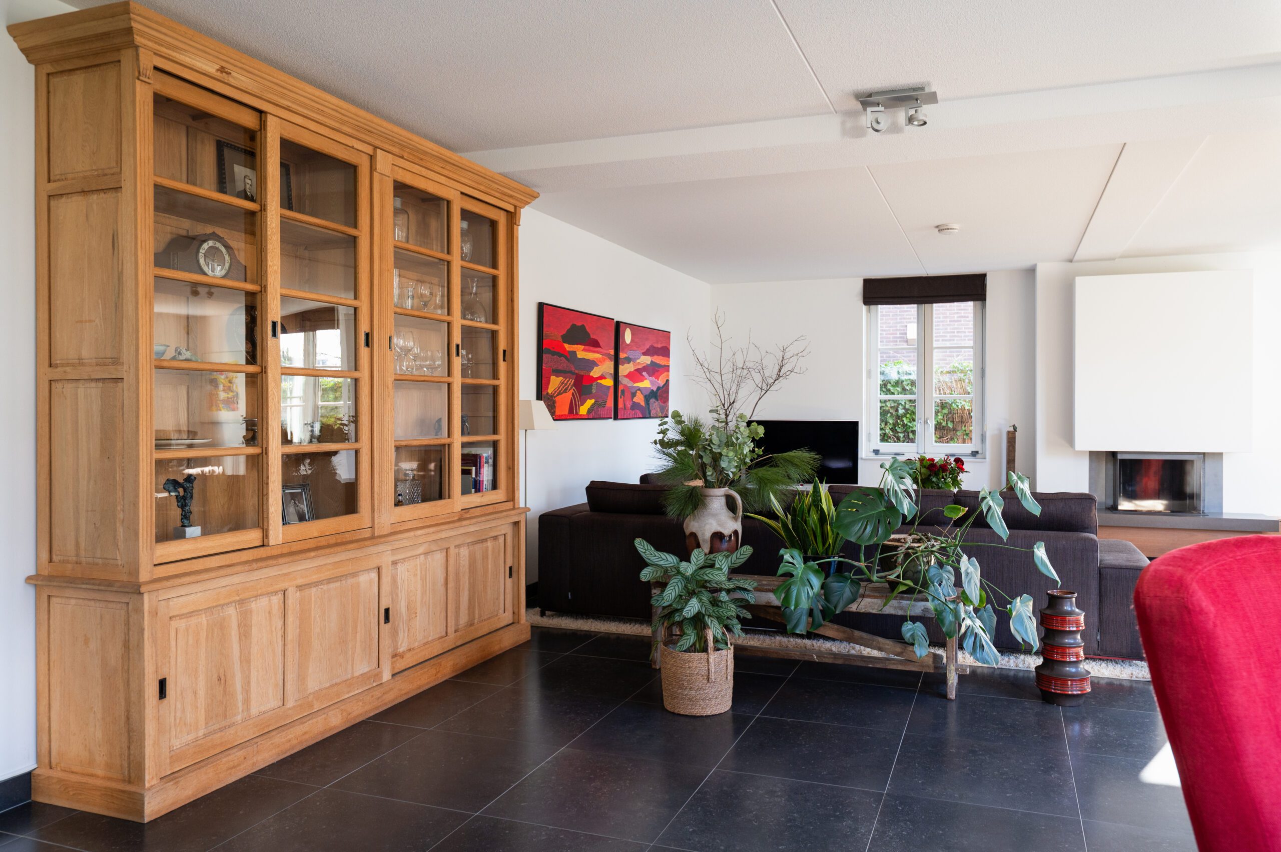 Aan de voorzijde van de woning bevindt zich de levendige, compleet uitgeruste keuken, voorzien van alle benodigde inbouwapparatuur. Aansluitend vindt u de ruime eethoek, ideaal gesitueerd tussen keuken en living, waardoor een open en uitnodigende leefruimte ontstaat. De aangrenzende woonkamer vormt een sfeervolle plek om te ontspannen, met een uniek ontworpen open haard met aan beide zijden een aangebouwd meubel als warm middelpunt. Dankzij de klassieke houten raamroedes geniet de gehele begane grond van een prachtige natuurlijke lichtinval dat zorgt voor een gezellige ambiance.