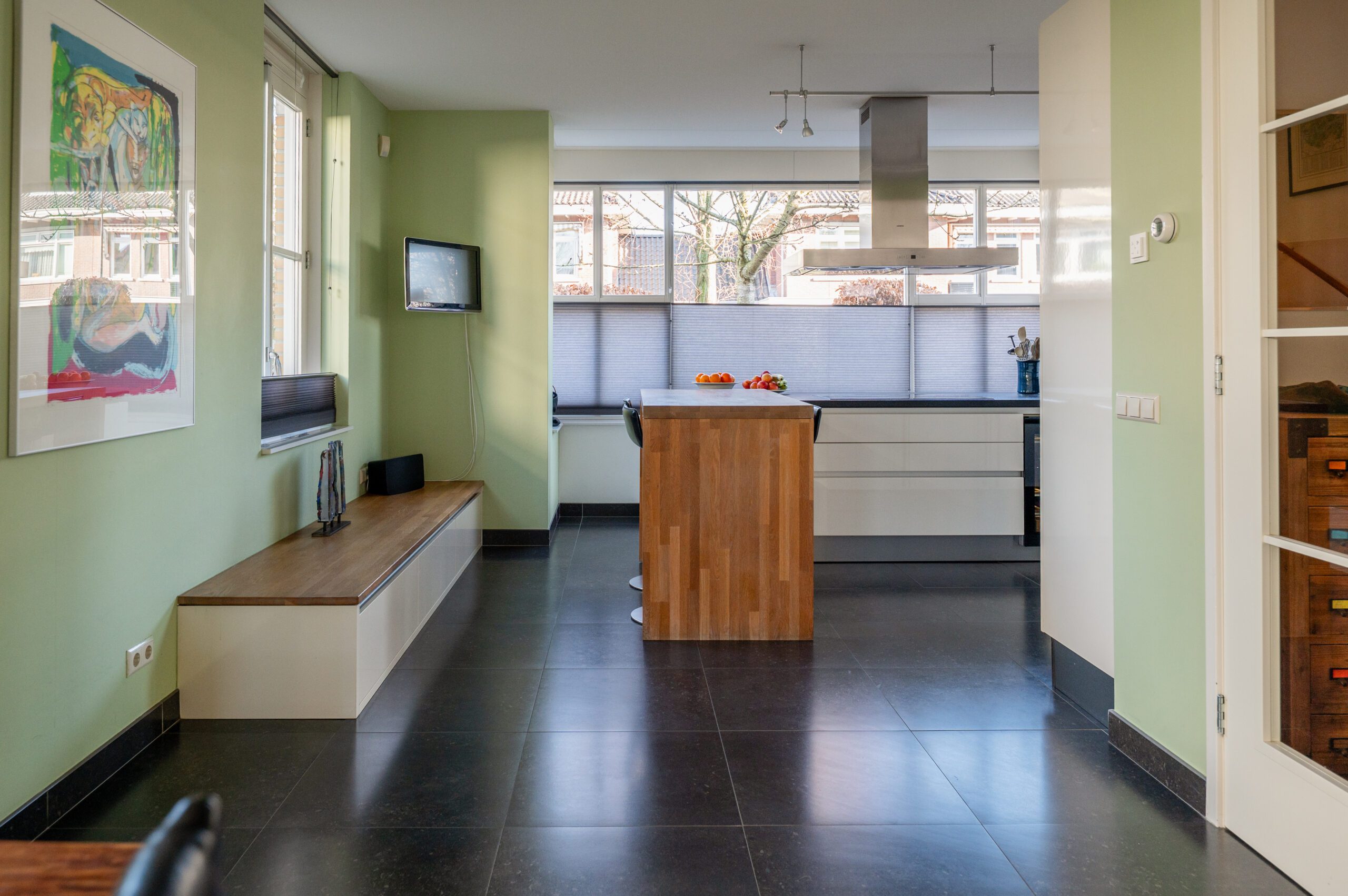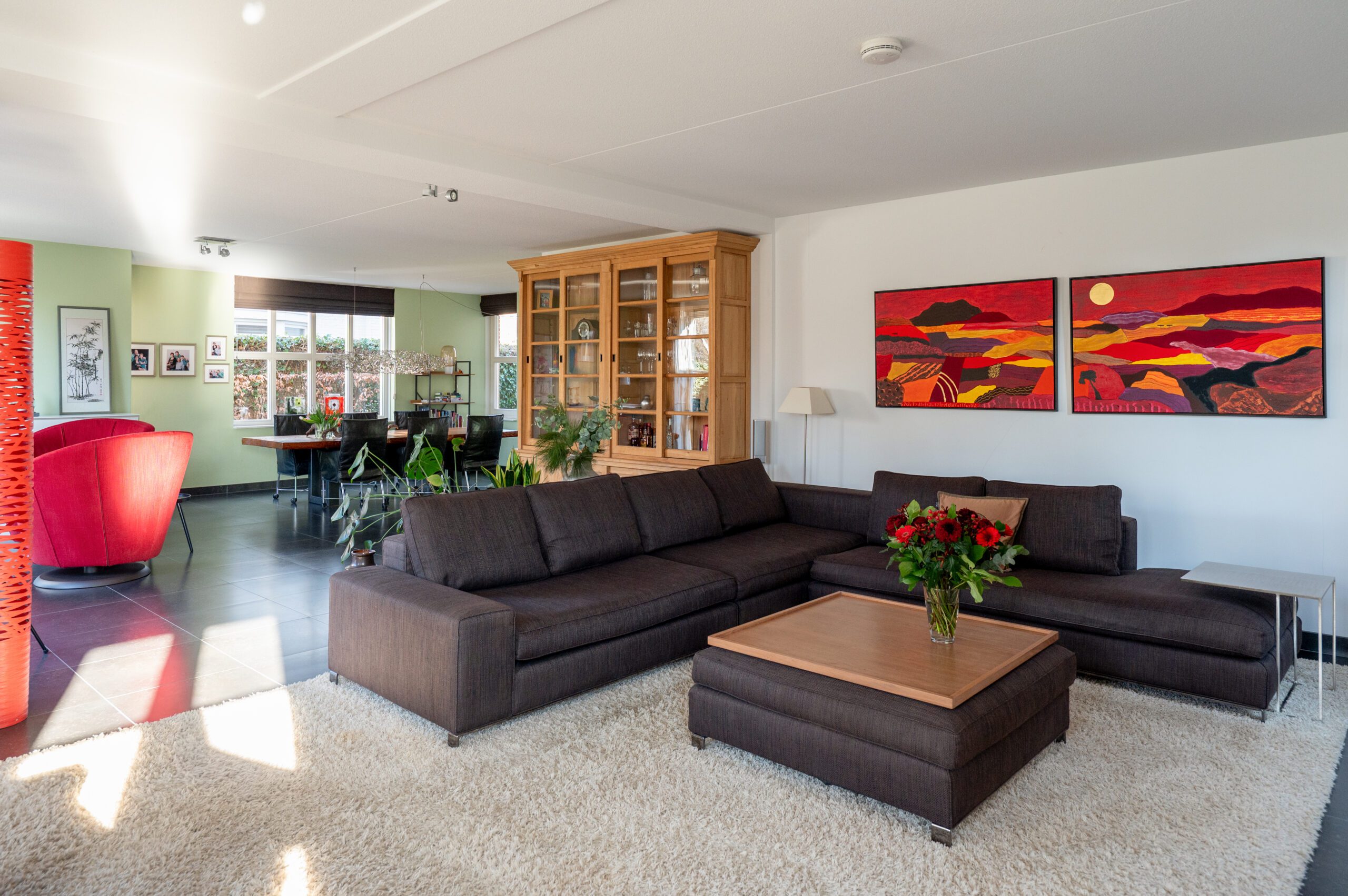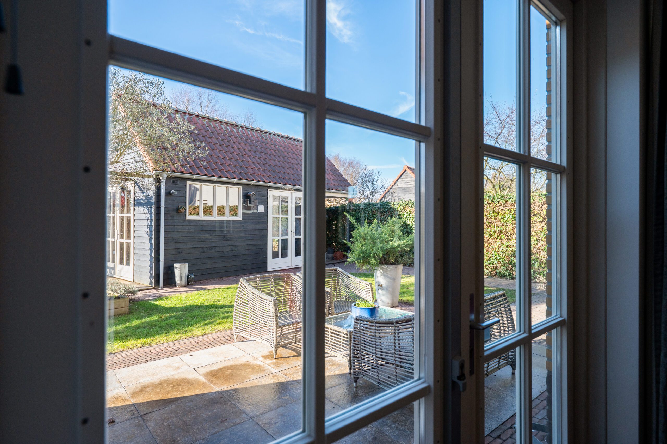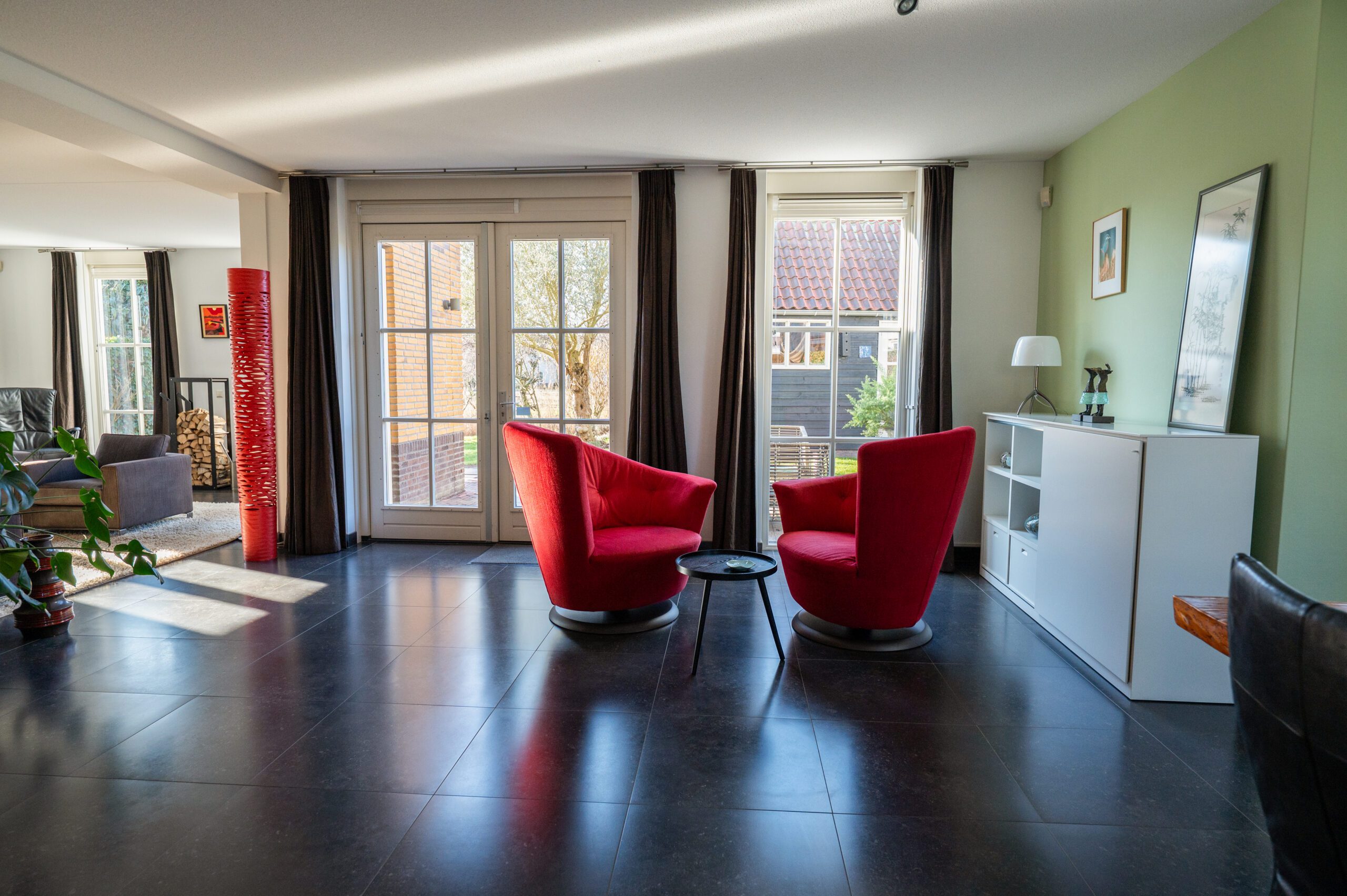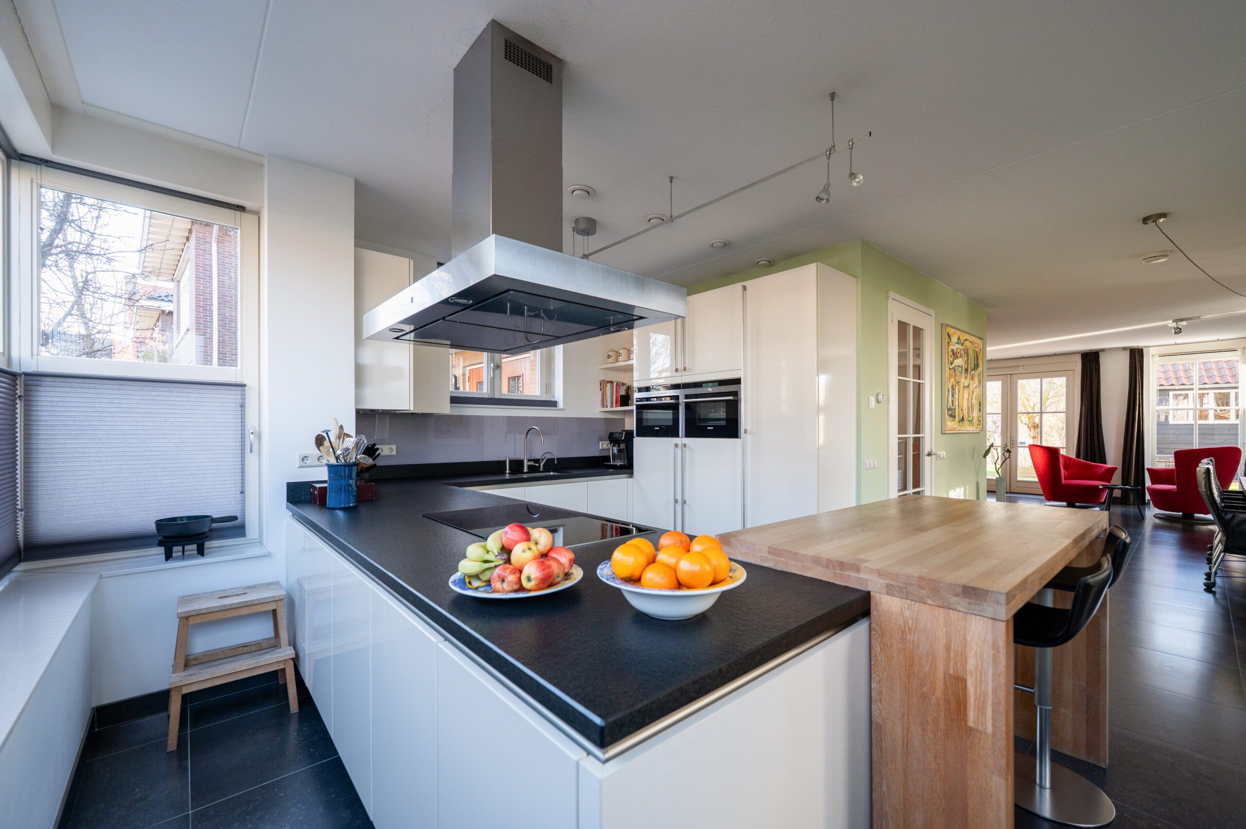 Aan de voorzijde van de woning bevindt zich de levendige, compleet uitgeruste keuken, voorzien van alle benodigde inbouwapparatuur. Aansluitend vindt u de ruime eethoek, ideaal gesitueerd tussen keuken en living, waardoor een open en uitnodigende leefruimte ontstaat. De aangrenzende woonkamer vormt een sfeervolle plek om te ontspannen, met een uniek ontworpen open haard met aan beide zijden een aangebouwd meubel als warm middelpunt. Dankzij de klassieke houten raamroedes geniet de gehele begane grond van een prachtige natuurlijke lichtinval dat zorgt voor een gezellige ambiance.